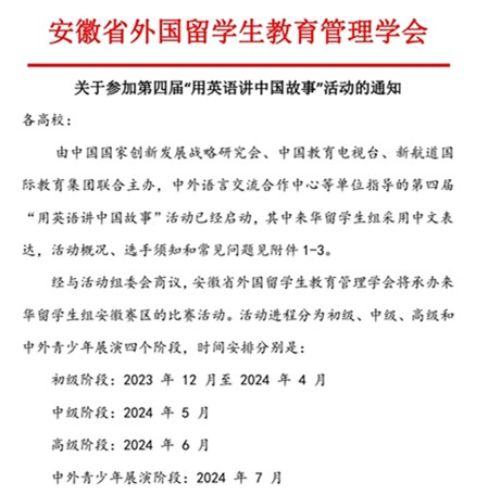 安徽省外国留学生管理学会承办来华留学生组安徽赛区的比赛活动。活动将分为初级阶段、中级阶段、高级阶段,经过各阶段展示脱颖而出的选手将于2024年7月汇聚最后的中外青少年展演。