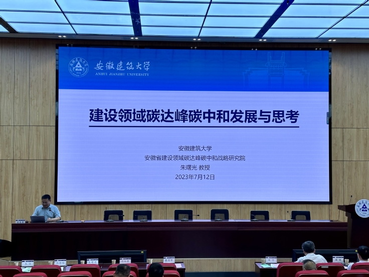 本网讯 节能宣传进校园,低碳发展讲科普。7月12日,在安徽省住房城乡建设厅指导下,我校联合安徽省建筑节能与科技协会承办了建筑节能降碳科普报告会。校党委常委、副校长蔡国军出席会议。省住房城乡建设厅建筑节能与科技处副处长朱力和胡浩威、省科技厅社发处二级调研员周军捷、三级主任科员王孝文、省发改委环资处副处长周强、省机关事务管理局一级主任科员方诚、省建筑节能与科技协会会长项炳泉、副会长叶长青,以及省节能与科技协会会员代表和学校师生共150余人参加了科普报告会。