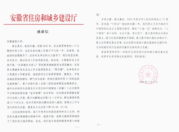 本网讯 近日,我校收到安徽省住房和城乡建设厅发来的感谢信,对学校在支撑安徽省住房城乡建设领域工作的突出贡献致以诚挚感谢。感谢信着重强调我校在建设领域碳达峰碳中和、建筑节能、装配式建筑等领域工作有力、成果丰硕。