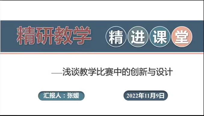 张老师以“精研教学,精进课堂——浅谈教学比赛中的创新与设计”为主题,从“说课流程”、“教学内容”、“教学设计”、“教学创新”、四个方面进行分享,再结合自我参赛感悟、青年教师的特点,为我们带来最终的经验分享。