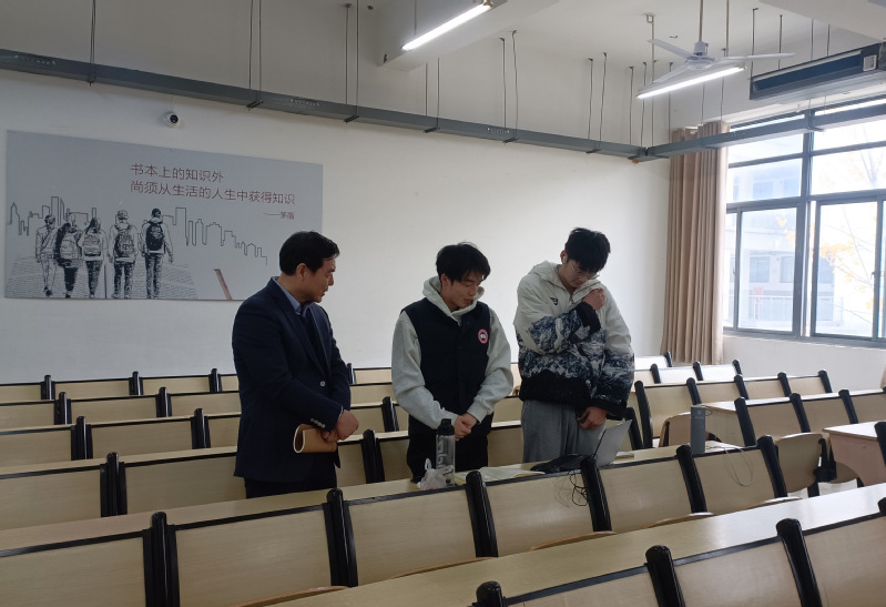 随后,黄显怀深入一线教师课堂教师课堂授课、学生听课开展随机巡课听课。他指出,课堂是学校教育教学工作的主阵地,是落实立德树人根本任务的关键环节,加强巡课听课是推动教风学风建设的重要举措;要坚持问题导向,加强制度设计,持之以恒推进课堂教学常态化监督检查,切实保障课堂教学质量。在巡查教室教学设施和仪器设备时,黄显怀自习学生亲切交谈,鼓励同学们要扎实掌握专业知识、积极思考探索未知,不断提升综合素养。