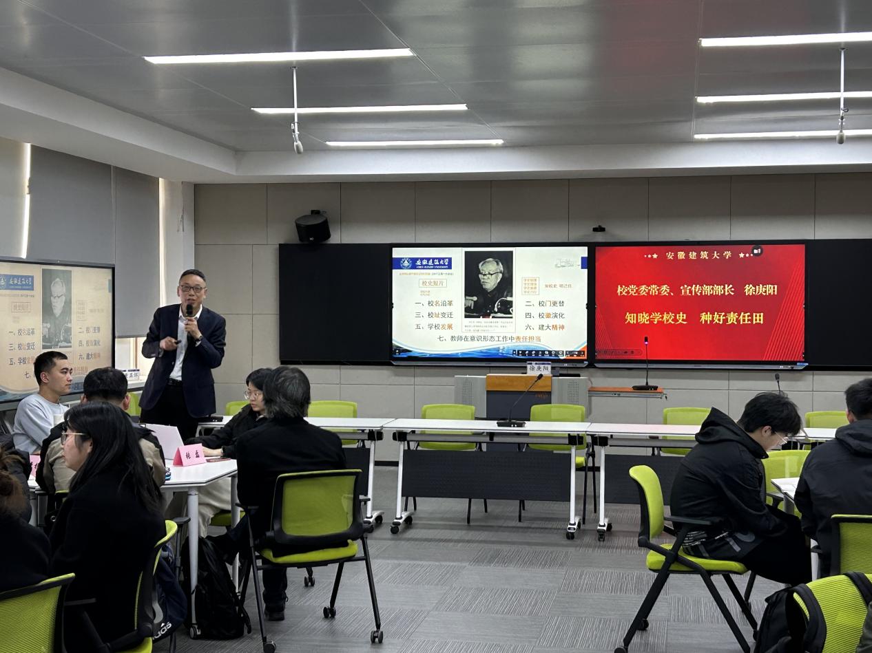 开班式结束后,进行了第一场校本培训,校党委常委、宣传部部长徐庚阳围绕“知晓学校史,种好责任田”这一主题,从校名沿革、校门更替、校址变迁、校徽演化、学校发展、建大精神这六个方面为新入职教师详细介绍了学校的历史变迁与发展。使新入职教师更加了解学校的历史和明确自己的使命,同时他指出了教师在意识形态工作中应有的责任担当,要求新入职教师树牢五线意识,对标楷模、力争高分、确保良好、保底及格、杜绝失责,守好一段渠、种好责任田,做好为学为事为人的示范。
