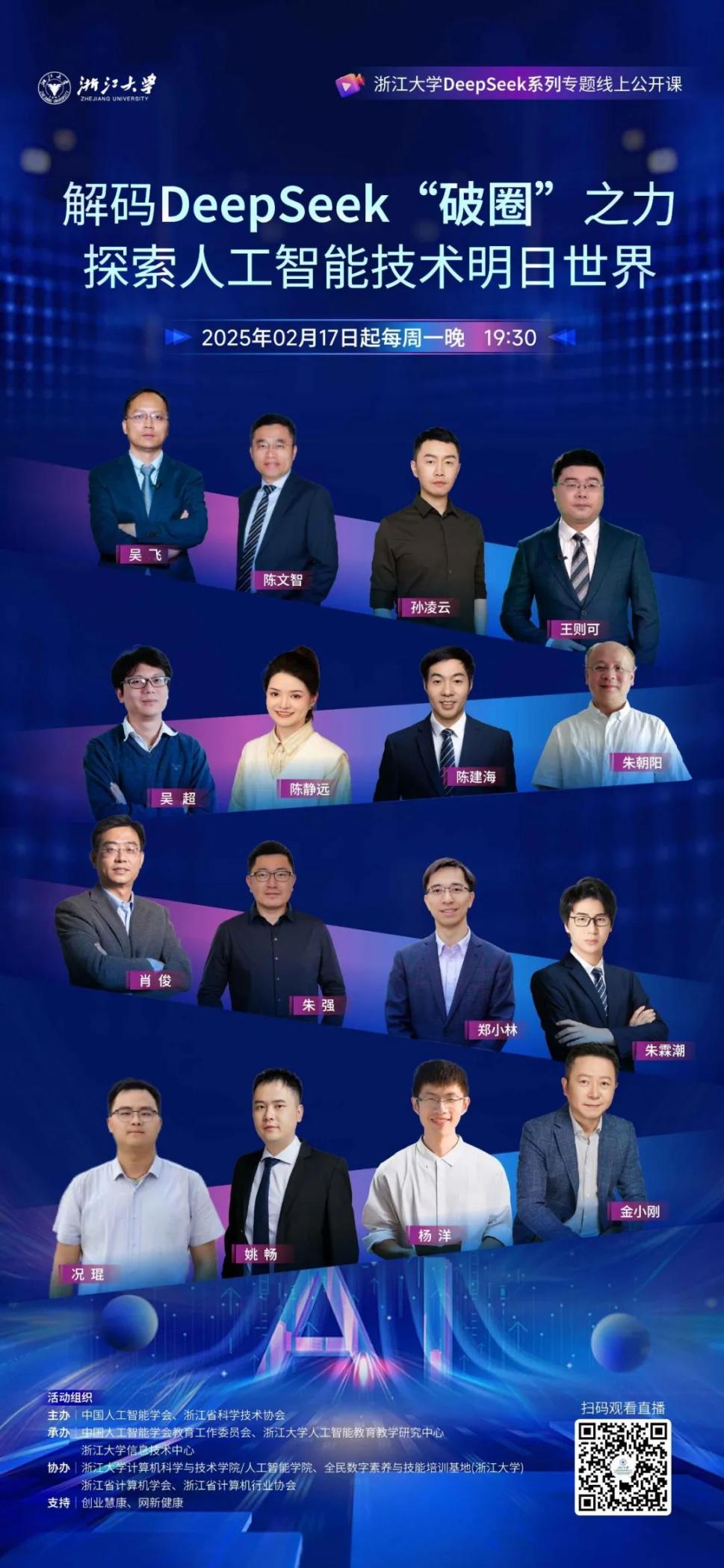 由浙江大学人工智能科研团队推出的DeepSeek系列专题公开课,自2025年2月17日起每周一晚19:30在线直播,聚焦技术突破、伦理探索与教育应用,内容涵盖AI三大主义、人机协作、模型优化等核心议题。