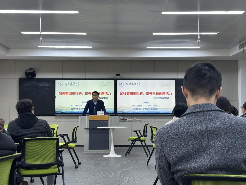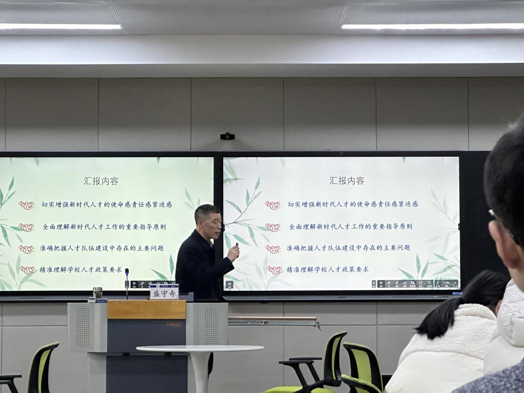 本网讯  为深化师德师风建设,提升青年教师科研创新能力,3月14日下午,教师发展中心在徽学楼举办新入职教师专题培训。校人事处副处长盛守奇、科技处处长雷经发分别围绕“大力弘扬教育家精神,加强教师队伍建设”和“加强有组织科研,提升科技创新活力”作主题讲座,50余名新入职青年教师参加培训。
