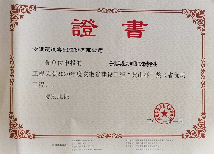 本网讯  12月6日,中国施工企业管理协会文件(中施企协字[2021 ] 107号)发布了《关于表彰2020-2021年度国家优质工程奖的决定》,公布了2020-2021年度国家优质工程奖获奖名单,是该校图书综合楼工程在2020年获得安徽省优质工程奖后再次斩获国家级大奖。