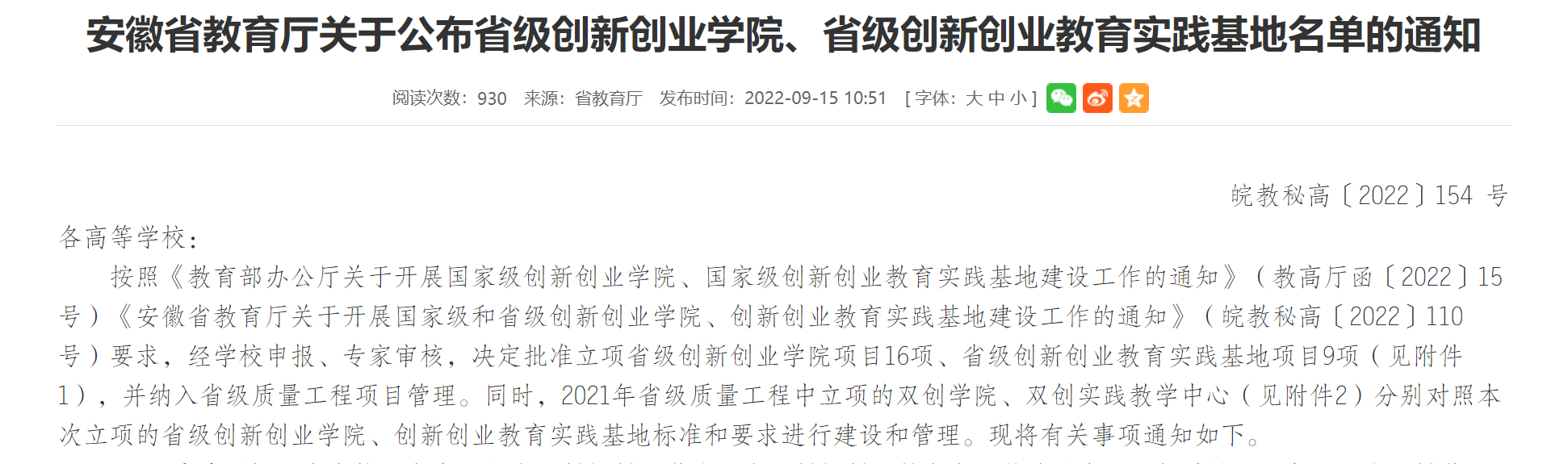 本网讯 近日,省教育厅发布《安徽省教育厅关于公布省级创新创业学院、省级创新创业教育实践基地名单的通知》,我校双创学院、双创实践教学中心项目获得立项。