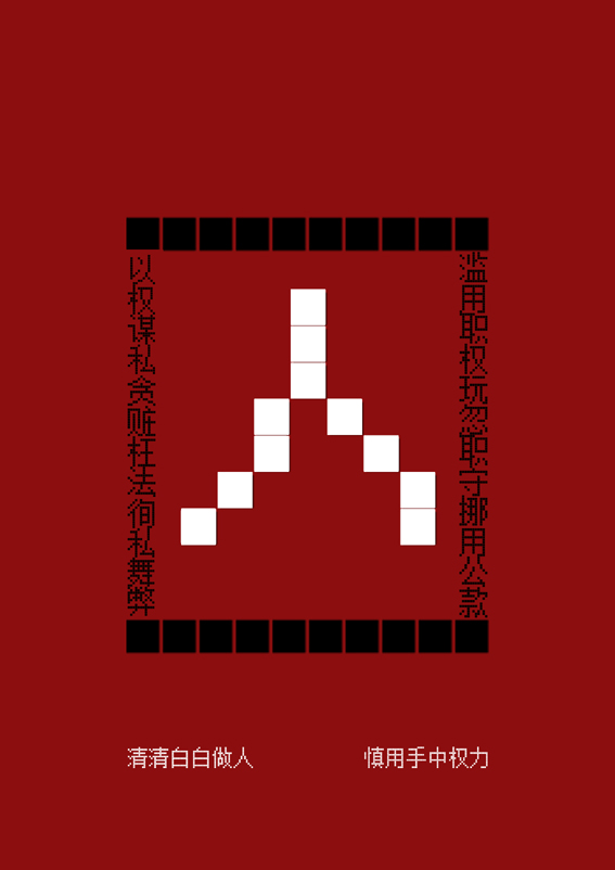 本作品化字入形,意在说明廉洁用权是党内监督的题中应有之义,用权者需时刻警醒。
