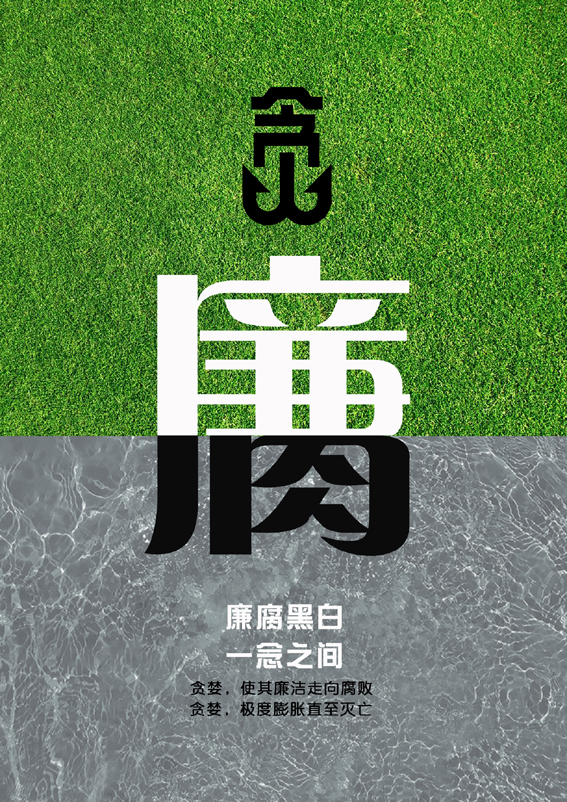 本作品以“贪为钩,采用阳光下的草坪和灰色的水面两种大相径庭的色彩对比,画面醒目、令人深思。