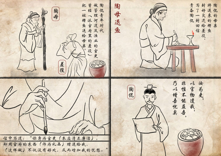 本作品出自《世说新语》陶母退鱼责子的故事,说明领导干部的家属能否抵制各种不正之风,保持清廉风尚,领导干部能否保持廉洁的一个重要因素。(作者:陈旭;审稿:张兆许)