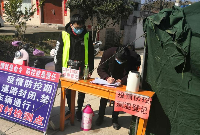 机电学院19机械一班张成林参加宿松县孚玉镇大河村共青团志愿者活动,在疫情防控检测登记卡点执行宣传和测温任务,劝诫村里的大爷、大妈戴口罩,遣散聚在一起聊天的扎推人群,张成林说,村里的路上这几天冷清多了,但我作为志愿者此时却觉得安心,心里热火多了,毕竟村里人都是安全的。