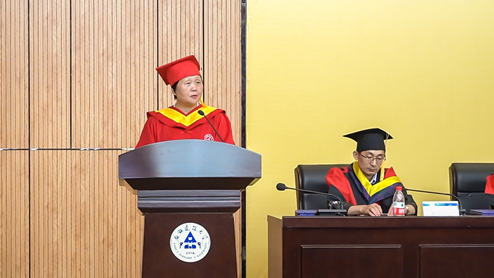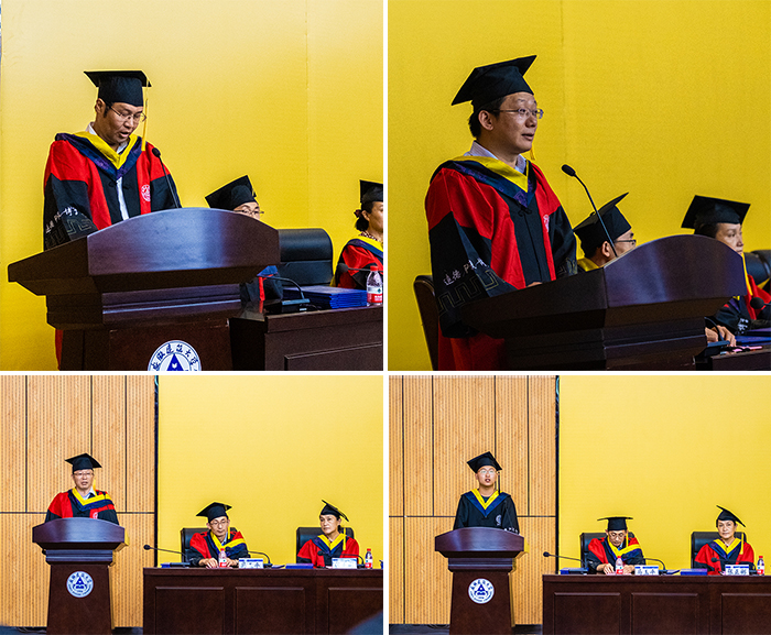 机电学院副院长雷经发代表机电学院致辞。他希望2020届全体毕业生传承建大人的家国情怀,把个人理想融入国家和民族的事业中,让青春在磨砺中出彩,在奋斗中升华。