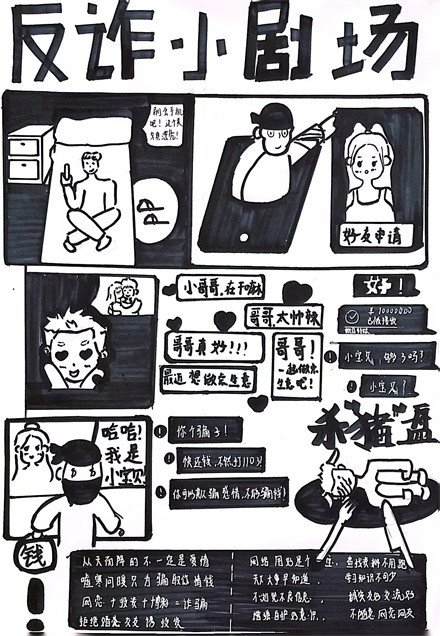 同学们以通俗易懂、幽默诙谐的漫画艺术形式对当前普遍出现的电信网络诈骗手段、作案方式及识别技巧等进行了解读和宣传,参与设计的同学化身反诈宣传员,意在提醒大家防范电信网络诈骗。