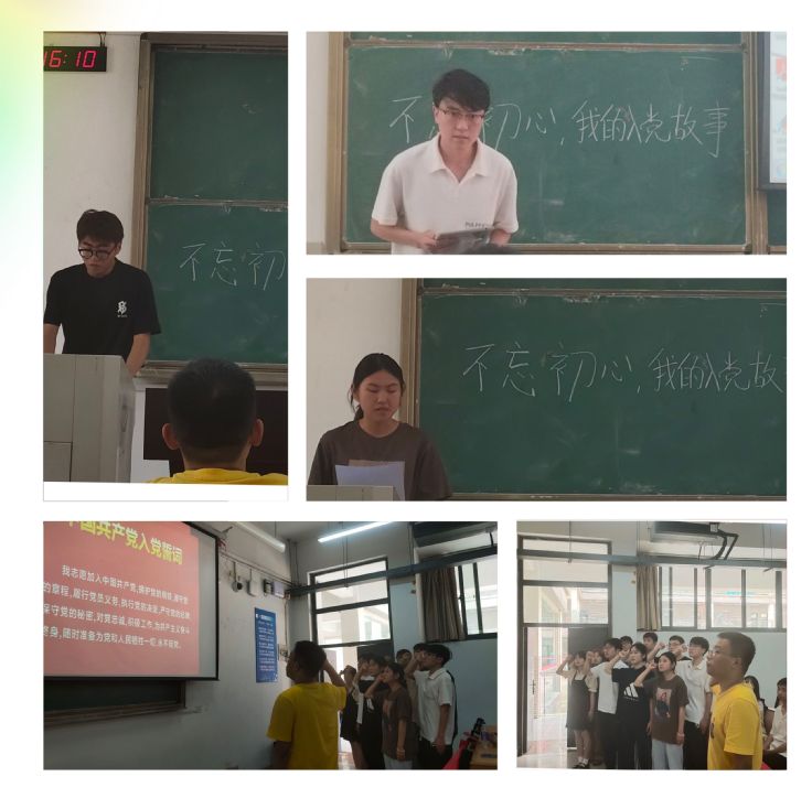 活动伊始,支部全体党员起立,奏唱国歌。三位毕业生党员代表以“不忘初心我的入党故事”为主题分享自己入党的心路历程,用朴素的语言、真挚的情感表达了爱党爱国的情怀。随后,支部全体党员面向鲜红党旗庄严地举起右手,重温对党的铮铮誓言。