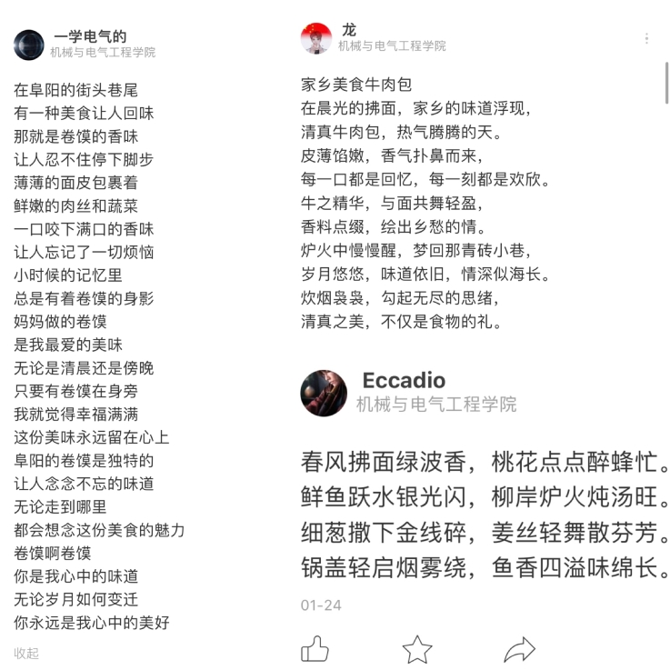 “茅台美酒佐香鲜,共庆全家美梦圆”,古代文人墨客常以诗歌来赞美美食,老味道里不仅有回忆,还有向上向善的文化力量。机电易班工作站举办“诗意美食”诗歌征集活动,鼓励同学们以最传统的方式记录美食,生动形象的文字让一道道美食跃然纸上,浓浓的年味萦绕在我们的生活中。诗词所形容的不仅是各种传统美食,更蕴含了人与美食之间剪不断的牵连,它是回忆,更是憧憬;它是缅怀,更是感恩。