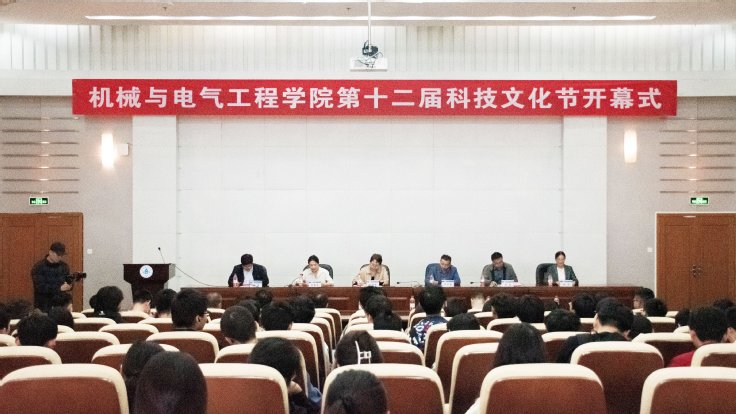 本网讯 4月17日,机电学院第十二届科技文化节开幕式在南区图书馆五楼报告厅举行。机电学院领导班子成员、指导教师及学生代表近两百人参加活动。