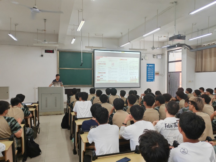 原机电学院2019级测控专业学生、现某学院大三学生王伟担任学校本次新生军训的教官,他围绕“当兵的契机,军旅生活难忘的瞬间,当兵的未来选择”三个方面,为同学们生动描绘了参军报国、建功军营的美好蓝图,为同学们算好参军入伍的“政治账”“经济账”“发展账”,鼓励青年学子携笔从戎、报效祖国,更以自己的成长故事激励在场的每一位学生到军营中体验别样青春、书写精彩人生,用青春热血助力强军梦想。