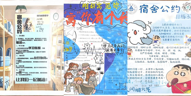 该活动以宿舍为单位设计宿舍文明公约并以海报的形式进行呈现,活动期间学生积极参与,精心设计,围绕学习、生活、卫生、作息等方面制定建议与条款,设计出体现宿舍特色与精神风貌的宿舍公约,凝聚着同学们的集体智慧,更汇聚着寝室内部集体的强大力量。