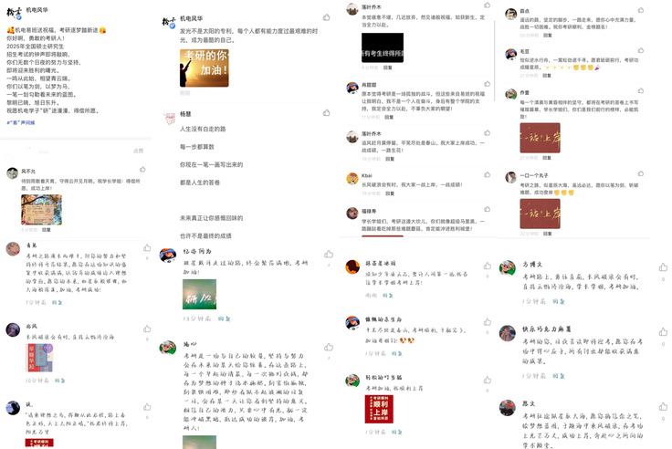 一条条留言如同一束束光,照亮了考研学子们疲惫的备考之路。他们在紧张复习间隙看到这些真挚话语,内心满是感动与力量。一位备考学生留言回应:“本觉疲惫不堪,几近放弃,然见诸般祝福,如获新生,定当全力以赴。”还有考生感慨道:“原本觉得考研是一场孤独的战斗,但这些来自易班的祝福让我明白,我不是一个人在奋斗,身后有整个学院的支持,我定会全力以赴,不辜负大家的期望!”