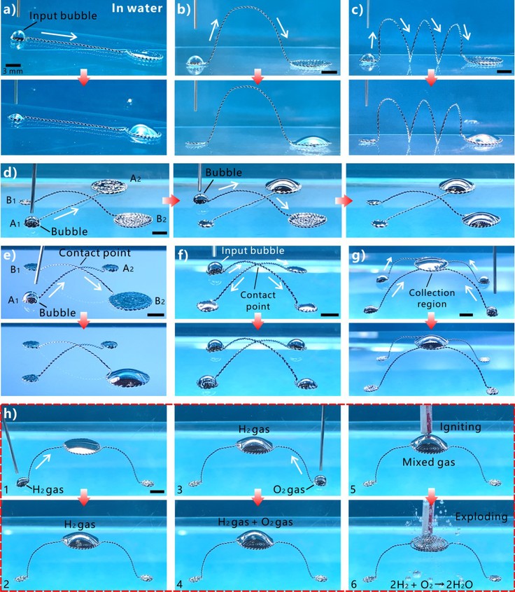 近年来,微流控技术在现代科学技术中得到了广泛的应用,目前已有大量关于操控水下气泡的研究报道,但是这些研究报道中的气泡是作为一个整体被移动或转移的,不能在微观层面操控痕量气体。鉴于二维气流控系统存在的固有局限性,本论文作者提出了一种三维自驱动气流控技术新策略,在304不锈钢金属丝上利用飞秒激光诱导表面微纳结构,并通过烘箱进行加热处理制备了超疏水金属丝,将中国传统编织技术与超疏水金属丝相结合,构建出了三维水下气流控系统。在水中,飞秒激光结构化的超疏水不锈钢金属丝在水环境中会截留空气,这为所设计的气流控系统中的气体传输提供了一个微尺度通道。由超疏水金属丝编织而成的不同圆形区域上的气泡,其拉普拉斯压差能够驱动气体传输,使气体在三维空间中沿着微尺度连接线自发流动。研究发现,不同的水下气流控系统只需相互接触就能连接在一起,这样各种单元就能轻松集成到一个多功能气流控系统中。除了基本的按需气体输送功能外,通过这些集成系统还能实现气体分裂、气体合并、气体二极管功能以及多线/多气体操作。
