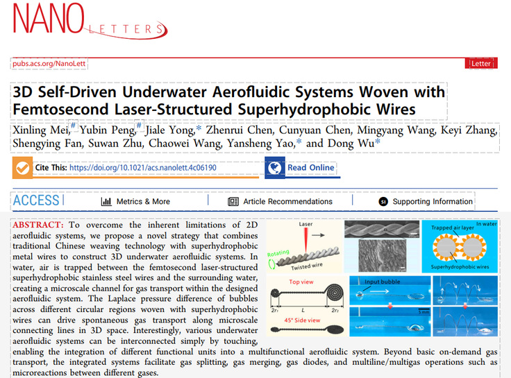 本网讯  2025312日,我校特种装备与极端制造科研团队在国际著名期刊《Nano Letters》(SCI一区TOP期刊,IF:9.6)上发表了题为“3D Self-Driven Underwater Aerofluidic Systems Woven with Femtosecond Laser-Structured Superhydrophobic Wires”的研究论文。该论文为团队近期连续发表的第二篇高水平论文,机电学院研究生梅新伶为该论文第一作者,青年教师彭玉斌博士为共同第一作者,姚燕生教授与中国科技大学吴东教授、雍佳乐副研究员为通讯作者。