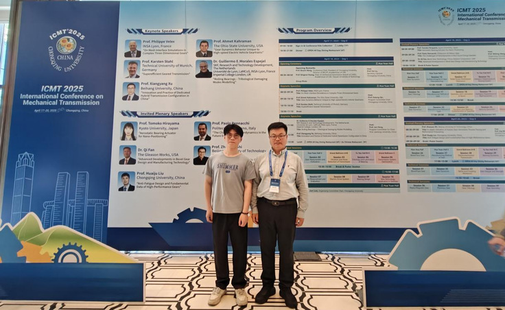 会议期间,建筑机器人及智能装备团队教师袁彬博士、硕士研究生徐子翔作了题为《Thermal coupling analysis and experimental study of residual stress on gear tooth surface for internal gearing power honing process》的会议报告,分享了考虑热力耦合综合作用下的新能源汽车电驱减速器齿轮珩削应力演化规律,为新能源汽车传动齿轮高强度、低噪音、长寿命运行提供了一定的理论支撑。