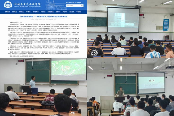 一次廉洁教育。学院纪委向全体毕业生党员发出《清风相随廉洁启航——致机电学院2025届全体毕业生党员的廉洁信》;各学生党支部、各班级紧密结合深入贯彻中央八项规定精神学习教育,组织学生观看廉洁教育微电影《底线》,通过交流研讨、案例分析等教育广大毕业生知敬畏、存戒惧、守底线,努力成长为让党放心、让社会敬重、让学校信赖的好干部、好职工、好公民。