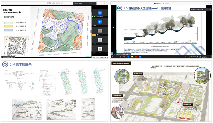 本次中期答辩依托“腾讯会议”平台进行,答辩过程包括学生汇报、教师提问、学生答辩、答辩组评定等环节。学生围绕“背景、场地分析”“文献、案例研究”“概念、逻辑生成”“总平、节点绘制”“下一步工作计划与安排”等内容进行在线汇报,答辩小组教师根据学生汇报内容在线提出问题及修改意见,学生结合对课题的理解和研究,与答辩教师在线探讨交流。