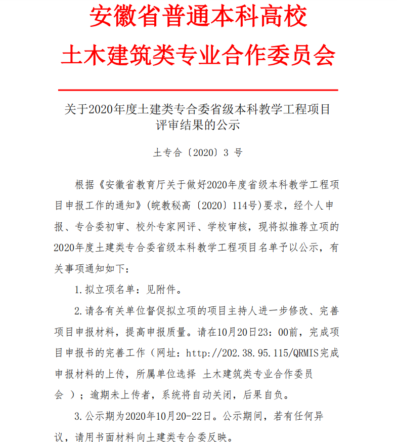 关于2020年度土建类专合委省级本科教学工程项目评审结果的公示