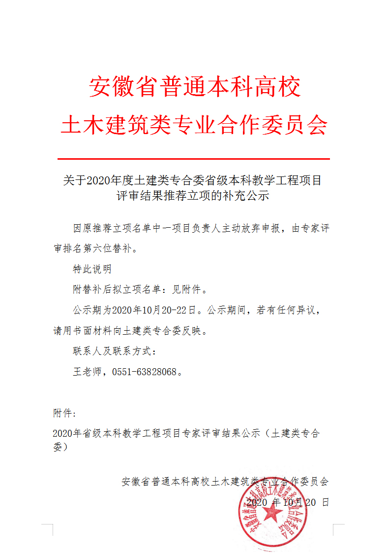 关于2020年度土建类专合委省级本科教学工程项目评审结果的补充公示