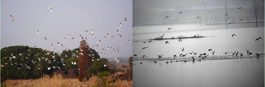 18级风景园林专业本科生吴浩、蓝天等人南淝河河口湿地突遇一群夜鹭,在芦溪湿地红嘴鸥从天空成群飞过。让人不禁想起李清照 “争渡,争渡,惊起一滩鸥鹭”的诗句。