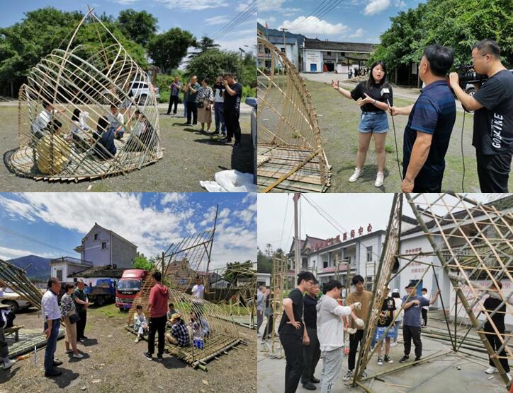 《认知与建造》实践课程作为建筑学专业实践课程中的一项,是19建筑学学生们入学后的第一次实体搭建。以竹子为主要材料,同时辅以绳索、螺钉等辅材,通过节点搭接组合成一个具有雕塑形式美感的建造小品。成果要塑造可供参观、休憩、体验、接触的空间,具有一定的难度。在学院领导、三溪镇镇政府、路西村村委会及村民们的大力支持及帮助下,师生克服时间紧张、天气恶劣、工具不足、材料缺乏等等困难,顺利地将作品搭建完成。514日上午,在旌德县电视台的记录下,指导老师、三溪镇政府和路西村村委会相关领导组成评委进行现场评选,最终评选出一等奖1名,二等奖2名,三等奖3名。