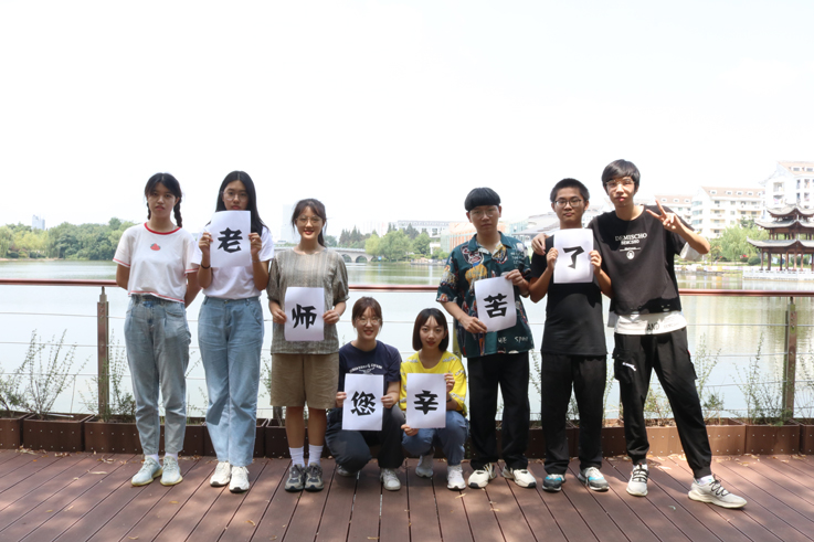 “老师,您辛苦了”。同学们贴心地准备了祝福语牌,祝愿老师们工作顺利,桃李满天下。