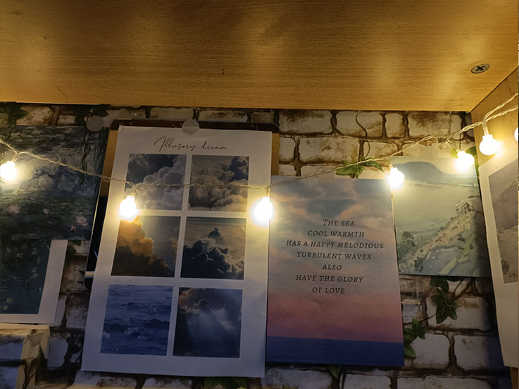 作为占据寝室大部分的墙壁,同学们发挥所长,用饰品装饰墙面,用画作营造氛围。