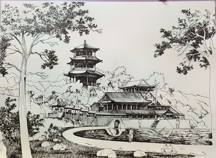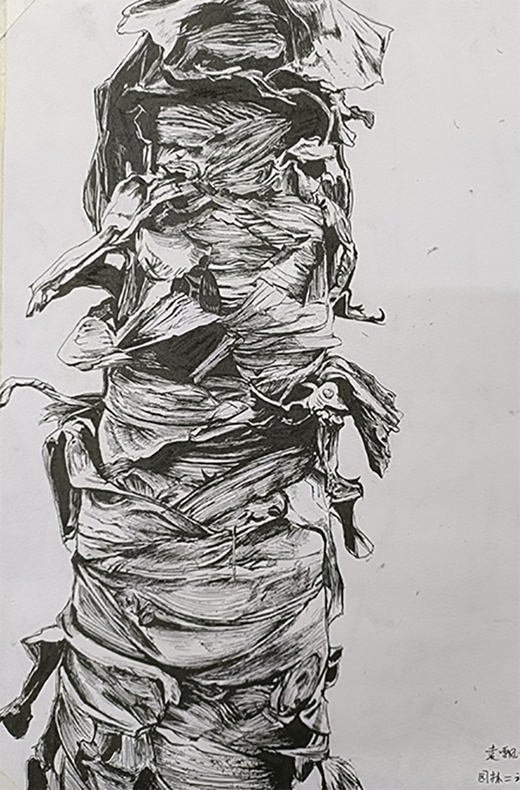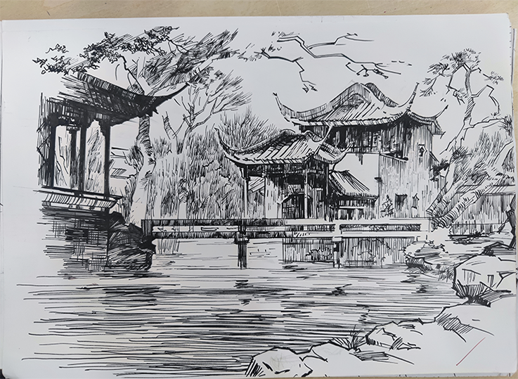木欣欣以向荣,我们要深入生活,学习树木的精神,使生命长青、品质升格。这一幅幅钢笔画,笔法细腻、笔锋熟练、线条感强,同学们结合建筑光影概念进行描绘,表达了生命的厚重与张力,极富画意诗情。