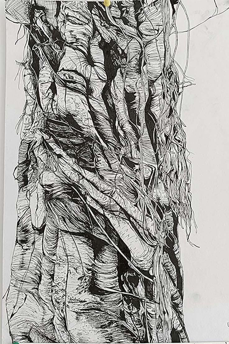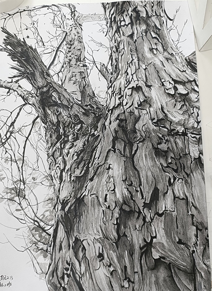 一张张树皮细部的手绘作品,是同学们对照校园里一草一木的临摹,展现出建规学子极其细腻的观察力。树皮丰富的纹理、多样的功能和价值是大自然的慷慨馈赠,值得不断探索和发现。