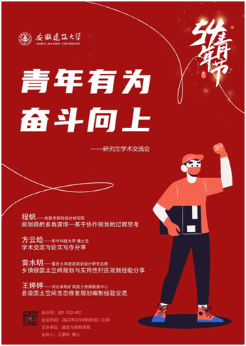 本网讯  5月4日上午,建规学院在实训综合楼6602会议室以线上线下结合的方式举办五四青年节研究生学术交流会,会议主题为“青年有为,奋斗向上”。交流会邀请了合肥市规划设计研究院、华中科技大学、重庆大学建筑规划设计研究总院、河北省地矿局国土资源勘查中心等单位4位青年学者,学院50多位研究生参加。
