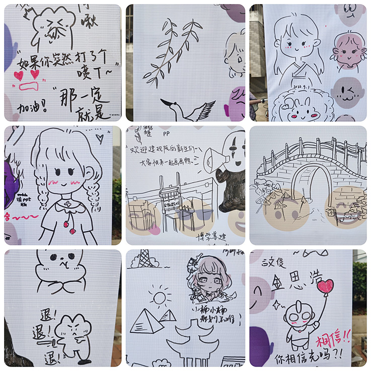 建规手绘签到墙,给新生一个展示自己特长的平台。每一个手绘的卡通形象都展示着新生丰富的想象力、无限的创造力、扎实的手绘功底。你一笔,我一笔,绘制建规大家庭!”