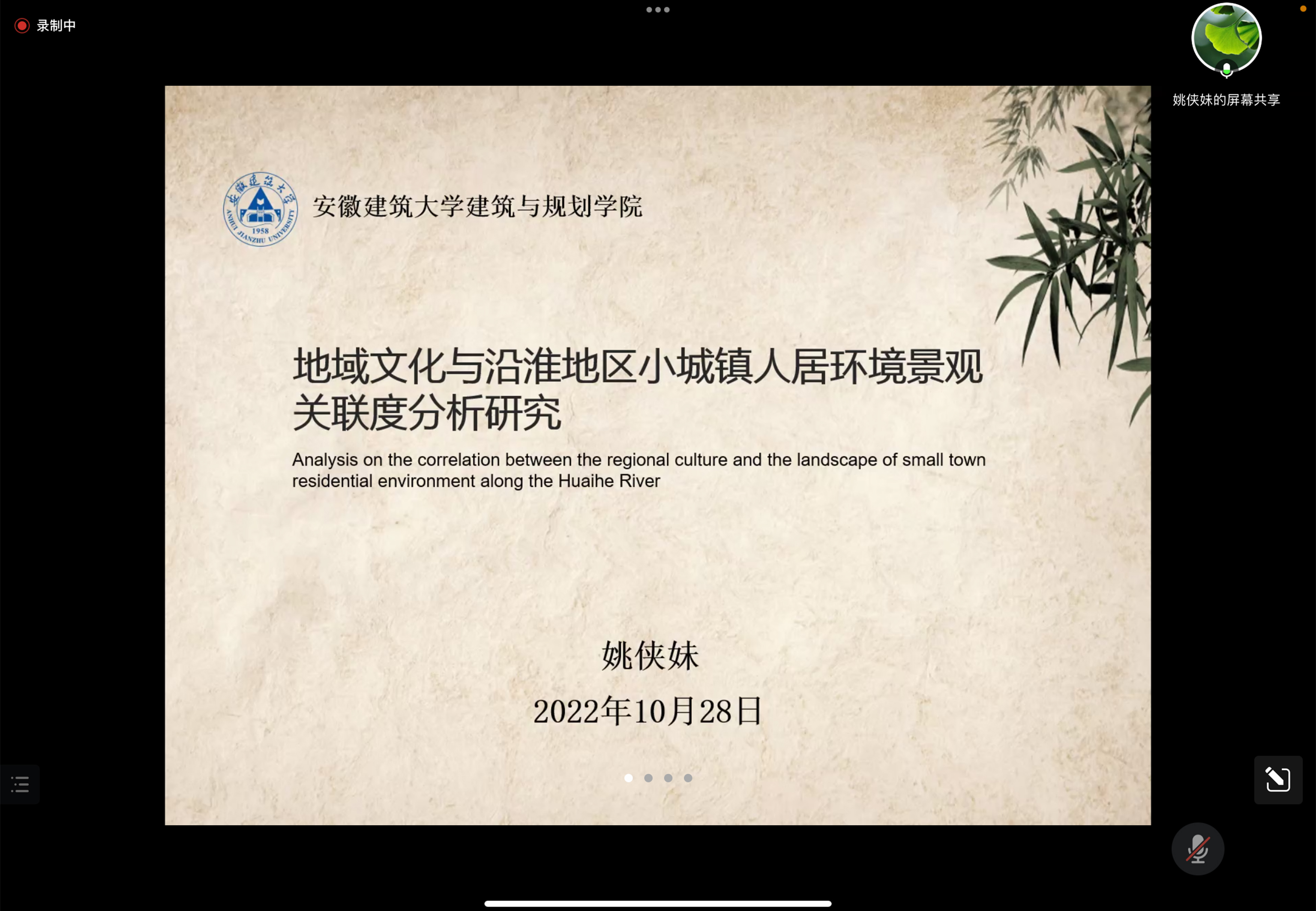 风景园林专业姚侠妹老师分享《地域文化与沿淮地区小城镇人居环境景观关联度分析研究》课题成果,介绍了地域文化的概念与范畴,以安徽省颖上县八里河镇为例,从人文环境、自然环境、社会环境三个方面解构了人居环境景观构成,从微观、中观、宏观角度都进行了系统的研究,对于不同尺度下的城乡生态环境效益进行评估。