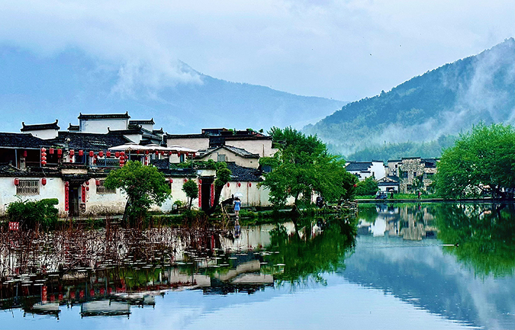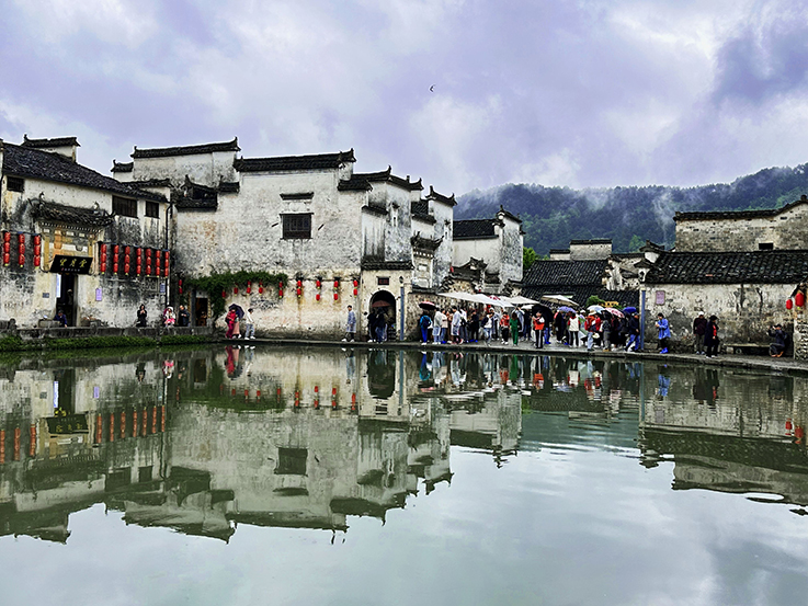 伴着毛毛细雨,我们踏入以古朴且富有特色的徽派建筑而驰名中外的宏村,首先映入眼帘的便是青砖黛瓦倒映在如镜似的南湖湖面,未散的雨雾飘渺在空中给这古老的村落平添了几分神秘。