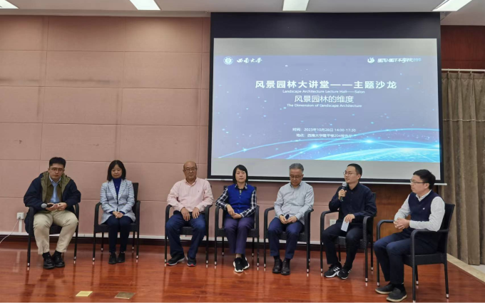 本网讯  10月28日,由西南大学主办,西南大学园艺园林学院承办的“风景园林的纬度”主题沙龙在西南大学隆平楼举行。西南大学园艺园林学院党委书记潘玉锋、院长宋洪元和与会嘉宾开展深入交流,副院长周建华主持活动。我院聂玮副教授受邀参加活动并做讨论发言。
