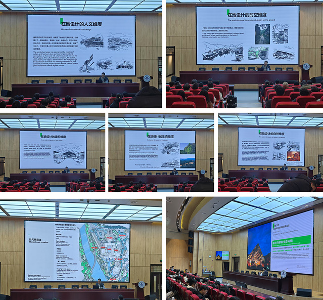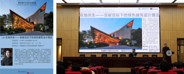讲座中,王教授首先介绍了“在地共生”的内涵与源流,强调了在地设计中考虑自然维度、建构维度、人文维度、生态维度、时空维度和理性回归的重要性。通过保持与修复生态环境、在地化的建筑布局、环境作用下的建筑有机生成、微气候空间设计、绿色行为与韧性空间、性能优化的围护结构、在地材料与建构、固碳材料与装配建筑、全生命周期等绿色建筑设计方法,开展江西恒茂御泉谷国际度假山庄、深圳正中隐秀山居酒店、南通中国珠算博物馆、深圳正中高尔夫会所、无锡江南新城实验中学等设计实践。通过系列实践案例阐释了构建空间、场所与环境的有机联系,建立建筑与人、社会、自然相互作用的共生秩序、吸纳地域建筑就地取材、因材致用的建构方式是实现建筑设计“双碳目标”的有效途径。