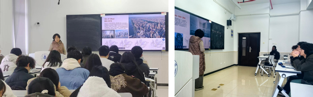 谈及建筑在材料,色彩搭配,光影的塑造板块上,对比分析了柯布的圣•皮埃尔教堂和李虎的时光塔,讲解了色彩、光影变化对建筑气质的影响。讲座内容以别具一格的视角和前沿的理念,挖掘建筑美学与结构的奥秘,为学生们带来前所未有的知识冲击与灵感启迪。