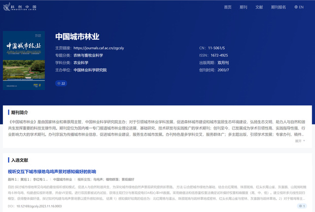 《中国城市林业》是由国家林业和草原局主管、中国林业科学研究院主办,国内唯一专门报道城市林业理论进展、基础研究、技术研发与实践推广的学术期刊。创刊至今,已发展成为学术引领性高、实践指导性强、行业影响力大的学术期刊。先后荣获第四届梁希林业图书期刊奖、RCCSE中国学术核心期刊(A)、中国农林核心期刊(A)、林草科技重点期刊。本次《中国城市林业》共有5篇高水平论文中英文摘要入选,这些翻译成果将面向全球科技工作者开放共享,并依托“科创中国”平台进行广泛宣传推广,同时提供便捷的中英双语查询检索服务。(文图:聂玮;一审:朱楠楠;二审:吴运法;三审:唐劲松)