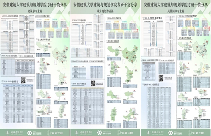 学院将建筑学、城乡规划、风景园林三个专业近几年的考研数据及全国三个专业可报考的院校可视化地展示出来,为新生大学学习生涯指引方向。