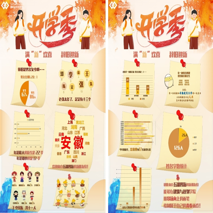 大数据时代下,从男女比例、出生年月、民族、姓氏、生源地各个方面展示新生信息,来自不同少数民族不同省份及港澳台新生。每一份数据都勾勒出新生群体的丰富画卷,为他们搭建了一个相互了解、共同成长的平台。