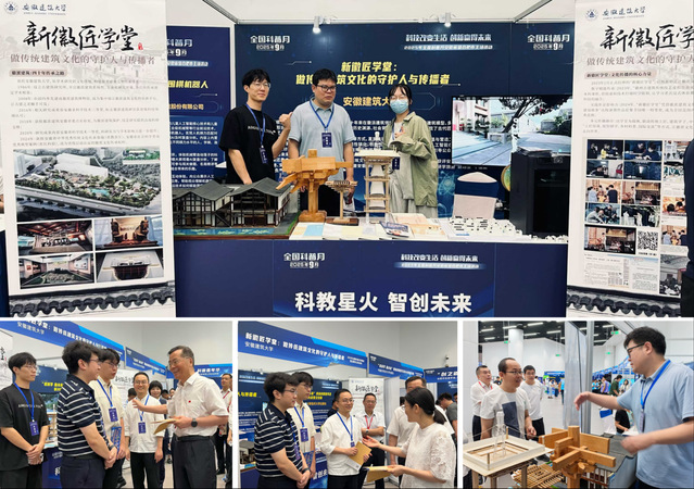 本网讯 9月7日,2025年全国科普月安徽省暨合肥市主场活动在安徽省科技馆正式拉开序幕。本次活动由安徽省科学技术协会、合肥市人民政府、安徽省全民科学素质纲要实施工作办公室成员单位共同主办。安徽省人大常委会副主任、省科协主席韩军,安徽省人民政府副省长任清华等出席启动仪式。由我校报送的“新徽匠学堂:做传统建筑文化的守护人与传播者”项目成功入选参展,成为本次活动中唯一以建筑文化为主题的展示项目,充分体现了我校在徽派建筑文化传承与创新方面的深厚积累与社会影响力。