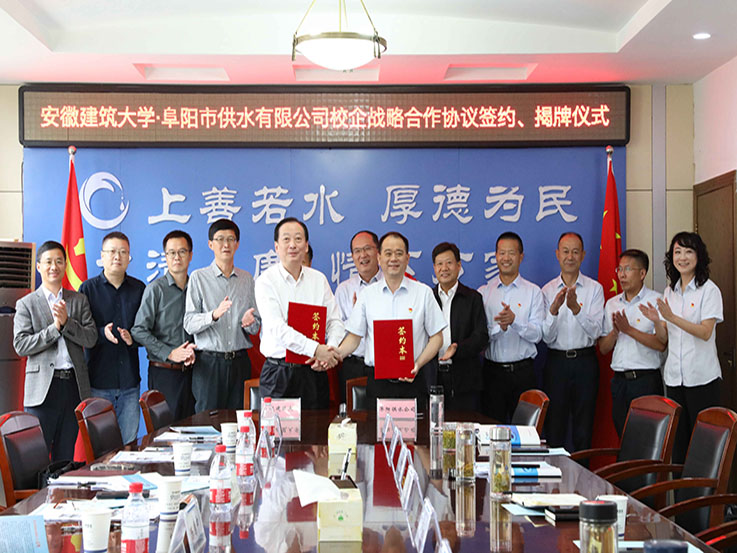 本网讯 9月23日,校党委常委、副校长蔡新立率队赴阜阳市供水有限公司签订校企战略合作协议,并为双方产学研合作基地、科技成果孵化基地揭牌,阜阳市城乡建设局党组成员、总工程师许存出席签约和揭牌仪式,阜阳市供水有限公司董事长张传峰热情接待了蔡新立一行。