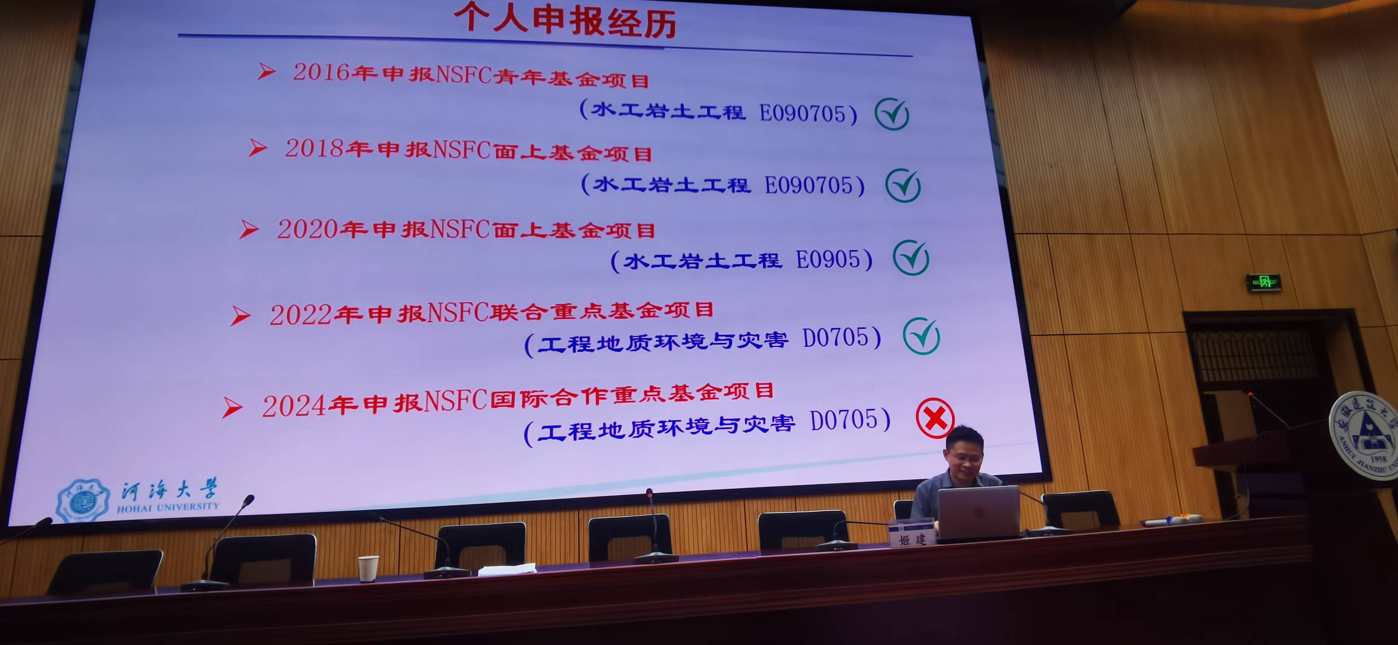 会议特邀河海大学姬建教授作《国家自然科学基金申报工作》专题报告。姬建教授结合自身国家自然科学基金申请书撰写及从事科研工作的经历,从选题、立意、撰写逻辑等方面分享了撰写申请书的经验和技巧。与会老师认真聆听、领悟吸收、受益匪浅。(文/图:沈丹,蒋芮;一审:翟玉婧;二审:赵强;三审:雷经发)
