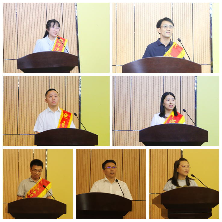 土木工程学院戴云彤、马克思主义学院张亮、科技处王平、土木工程学院韦璐、材料与化学工程学院张高展、安徽通源环境节能股份有限公司董事长杨明、艺术学院徐慧极分别代表优秀教学比赛获奖、优秀教师、优秀教育工作者、师德标兵、三全育人先进个人、三全育人先进个人杰出校友和新进教师上台交流发言。