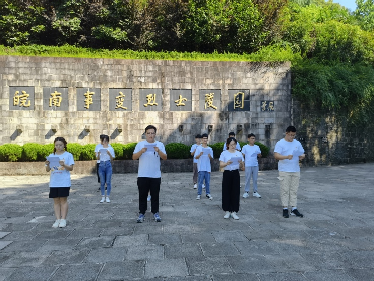 烈日炎炎,参加此次教育活动的学生党员在皖南事变烈士陵园门前集体朗诵《少年中国说》,声声呐喊“请党放心,强国有我”,铿锵有力,向党许下青春誓言。
